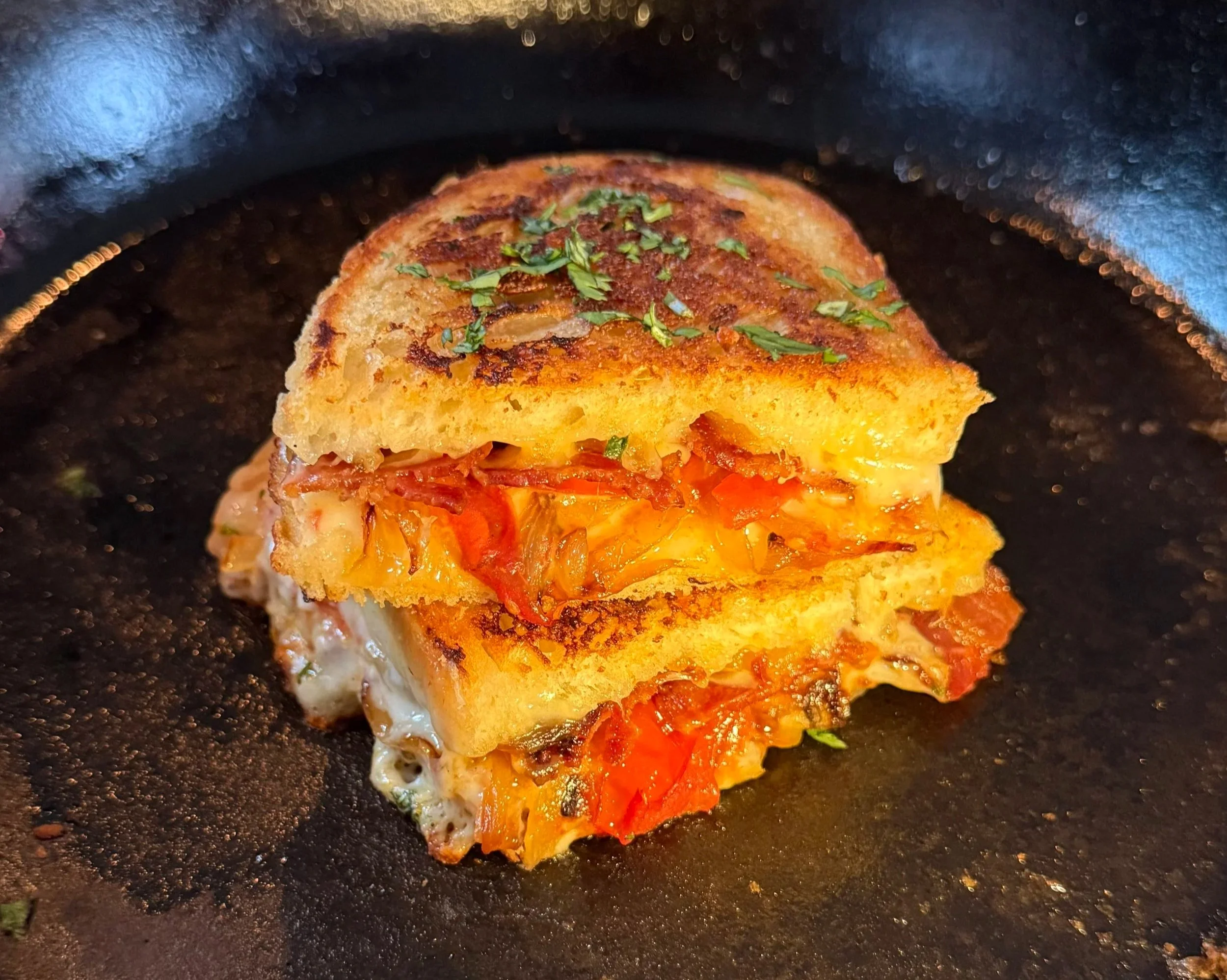 SOURDOUGH, PEPPER JACK, BACON, CARAMELIZED ONION & TOMATOES, COMPLETED with our signature seasoning
